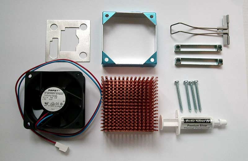 Außerdem ist die teure Kühlpaste Arctic Silver II verwendet worden, welche den Wärmeaustausch verbessert. Auch ein sogenannter Ag-Spacer sollte bei der Montage nicht fehlen (Cu, Ag und Au stehen übrigens im Periodensystem in der gleichen Nebengruppe IB). Er verhindert die Beschädigung des "Die" (die empfindliche CPU-Oberfläche).